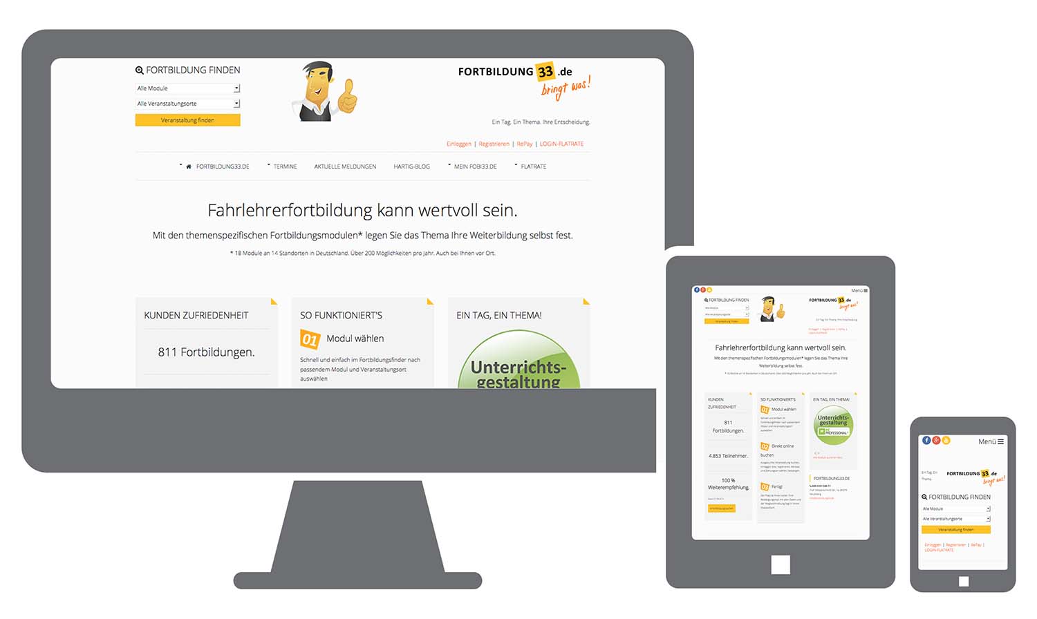 Und genau das haben wir getan: "mobile first" ist die Devise, unter der wir diesen nagelneuen Internetauftritt von FORTBILDUNG33.de geschaffen haben. Sie als Leser und als unser Kunde betrachten die Internetseite von FORTBILDUNG33.de mit sehr großer Wahrscheinlichkeit auf einem mobilen Endgerät. Unsere Kunden haben keinen Bürojob. Sie sitzen im Auto und dort brauchen Sie auf Ihrem Smartphone oder Ihrem Tablet die Informationen, die wir Ihnen gerne zur Verfügung stellen wollen. Einfach. Unkompliziert. Ohne Fummelei.