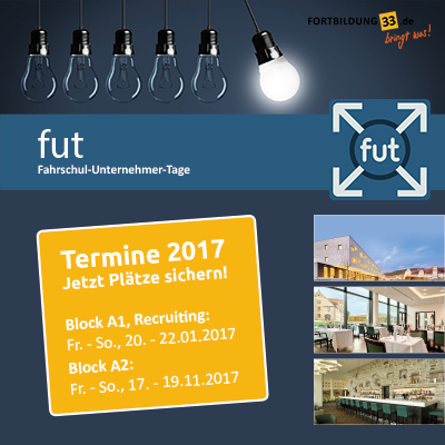 Aus diesem Grund widmen sich die ersten fut Fahrschul-Unternehmer-Tage dem Thema Recruiting. Denn in Zeiten des immer größer werdenden Fahrlehrermangels wird die Beschaffung und Bindung guten Personals zum entscheidenden Wettbewerbsvorteil.