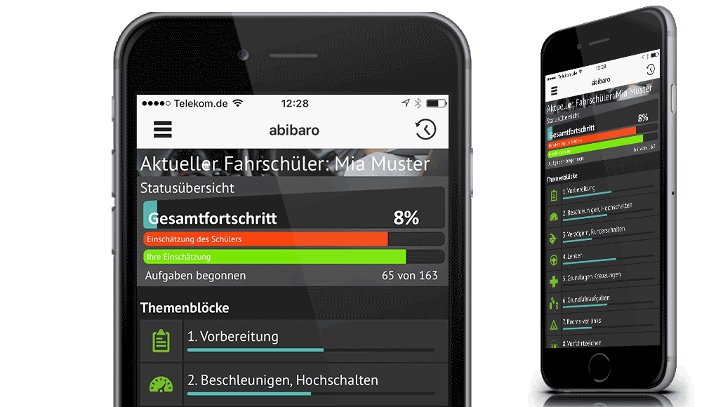 Was Ihrem Kunden jetzt fehlt, sind die "Fahrlehrersterne" in abibaro. Also Ihre Rückmeldung auf die Aufgaben, die er mit Klaus trainiert hat. Und jetzt kommt der eigentliche abibaro-Effekt: In der ersten "echten" Fahrstunde bei Ihnen, holen Sie sich in der abibaro-App die Bewertungschronik Ihres Fahrschülers hervor. Auf einen Blick sehen Sie alle Aufgaben, die Ihr Kunde auf dem Simulator begonnen hat. Aus Fahrlehrersicht besternen Sie jetzt, wie gut die einzelnen Aufgaben in der Praxis funktionieren. Fertig.