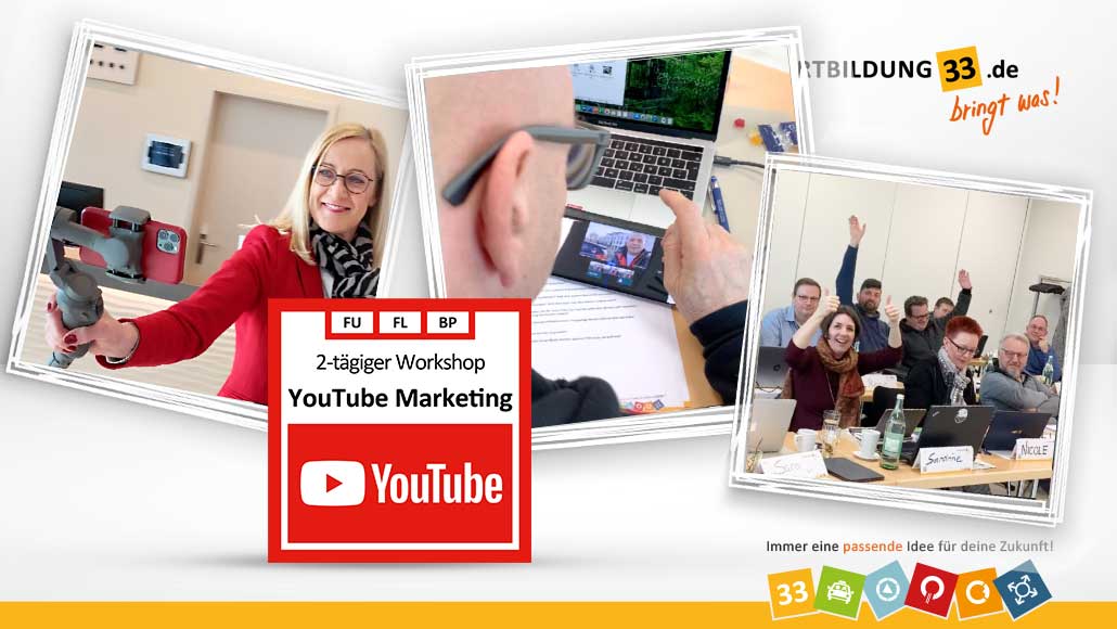 Mit einem Laptop und Smartphone ausgerüstet gingen die Teilnehmer ans Werk. Grundlage bildet ein korrekt eingerichteter Kanal, der dafür sorgt, dass man bei YouTube besser gefunden wird und auch rechtlich abgesichert ist. Als Boni von uns wurde für jeden Teilnehmer ein passend dimensionierter und gestalteter Kanal-Banner und dazu passendes Kanal-Logo erstellt - ein Service von Fortbildung33.de.