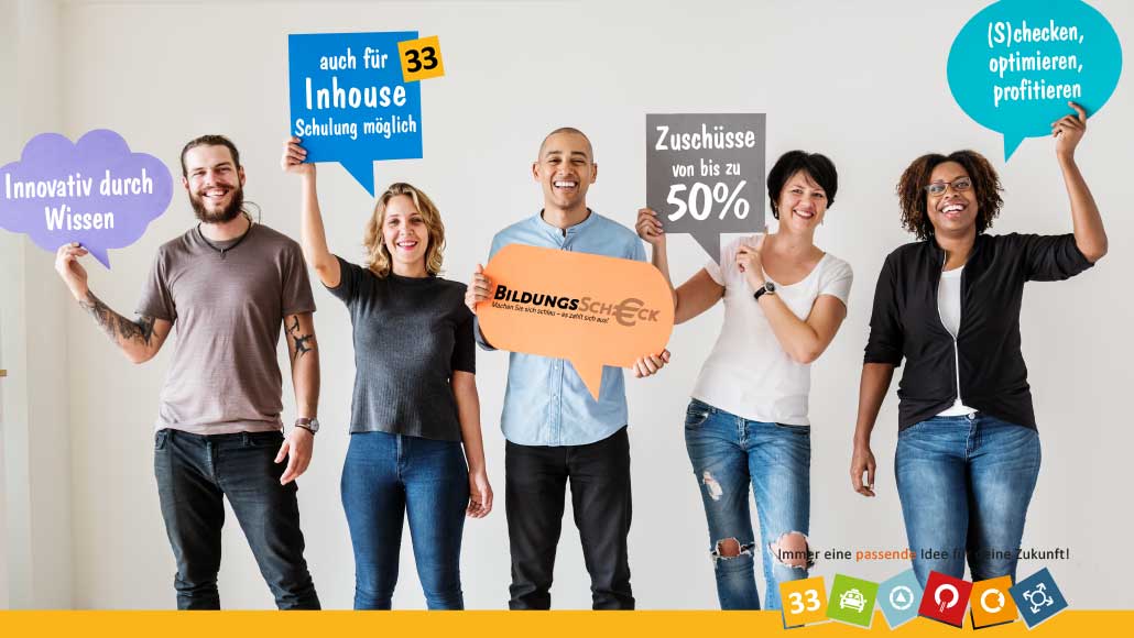Geben Sie sich und Ihren Beschäftigten die Chance, sich beruflich weiterzubilden – Ihr Unternehmen wird von den neuen Kenntnissen profitieren. FORTBILDUNG33.de unterstützt Sie dabei. Beispielsweise in Form von Inhouse-Seminaren oder nachhaltigen Train & Perform-Programmen – zugeschnitten auf die Bedürfnisse Ihrer Mitarbeiter. Durch die Novellierung des NRW-Bildungsschecks können Sie seit Mai 2018 auch solche internen Firmenschulungen fördern lassen.